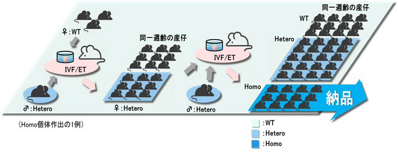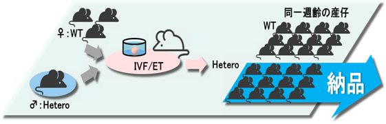 ご提供頂いた少数の♂マウスとC57BL/6♀との組み合わせで体外受精を実施し、 同一週齢のマウスをご希望のスケールで納品致します (作業期間:約3ヶ月)。 |
